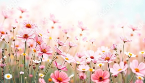Soft pastel watercolor painting of a whimsical flower meadow, delicate blooms in soft hues, airy, lovely