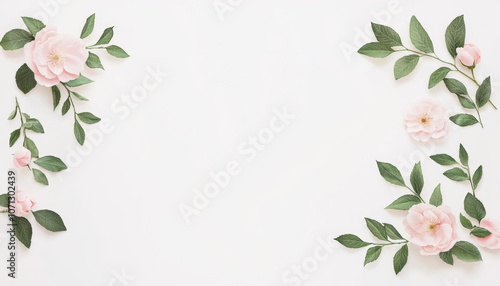 Soft pink flowers and green leaves create a delicate frame on a white background, perfect for invitations or artistic designs.