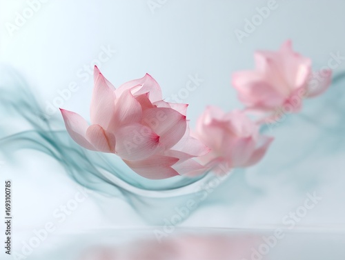 Soft pink lotus flowers floating in air on light pastel background