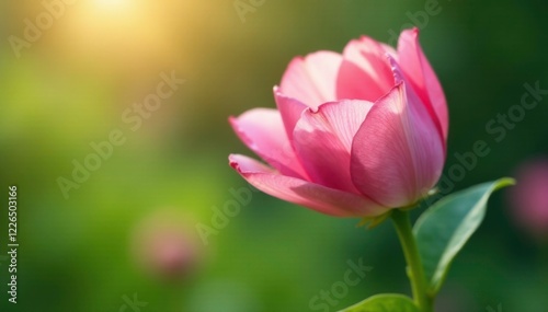 Soft pink petals unfolding from a slender stem under gentle light, pink, greenery