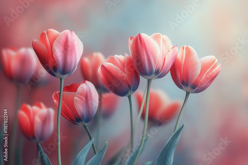 Soft pink tulips in dreamy background, illuminated by gentle light