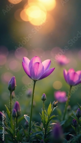 Soft purple petals unfold on a misty meadow at dawn, bokeh, flowers, atmospheric effect