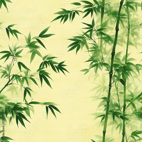 Soft seamless bamboo pattern on light yellow background, elegant Asian foliage design for wrapping paper and textiles.