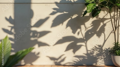 Soft shadows of tropical leaves cast on a cream wall create a minimalistic backdrop ideal for product presentations in spring and summer.