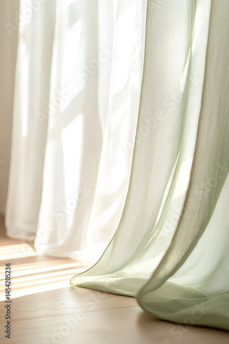 Soft sunlight filtering through delicate sheer curtains in a peaceful interior space.