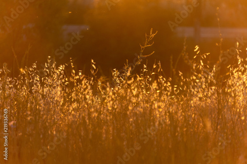 soft sunlight, lights the grass at sunset