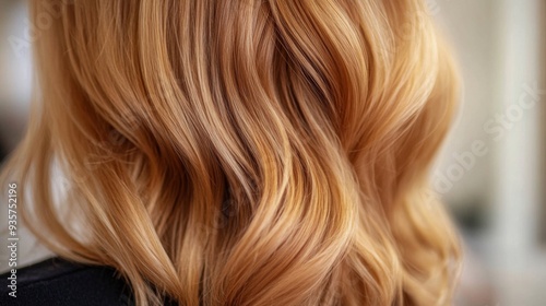 Soft, wavy hair in a striking copper hue flows gently, reflecting light in a bright salon environment.