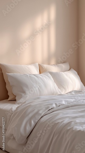 Soft white bedding with multiple pillows arranged on a neatly made bed against a light beige wall, sunlight casting gentle shadows in the background