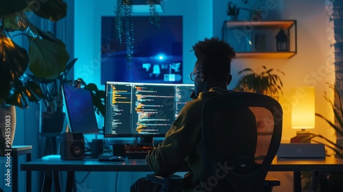 Software Developer Presenting Coding Portfolio in Sleek Professional Office Setting
