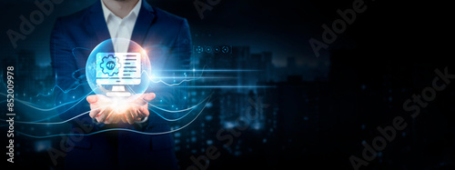 Software Development: Businessman Holding Global Network Connection of Data. Global Business. Innovation, Efficiency, Collaboration on Cyberspace.