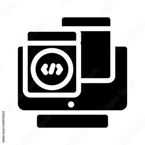 Software development icon glyph featuring symbols like code, cloud, servers, and debugging tools, ideal for tech projects, apps, websites, or programming-related designs.