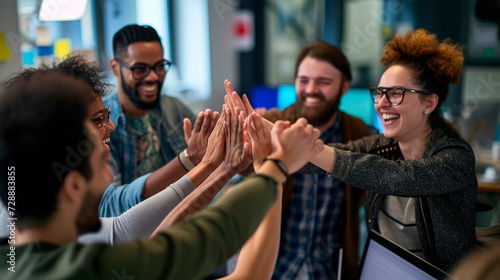 Software Development Team Celebrating Successful Launch of a New App. High-fives, smiles, and a collaborative atmosphere in a tech office