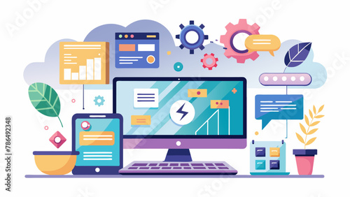 Software, web development, programming concept. Abstract Programming language and program code on screen laptop. Laptop and icons company network. Technology process of Software development. Vector