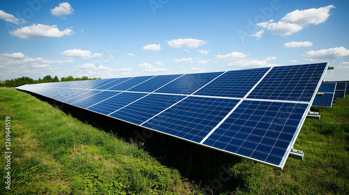 Solar farm and sun light. Solar power for green energy. Sustainable renewable energy. Photovoltaic power station or solar park. Solar panel installation and maintenance concept. Energy sustainability.