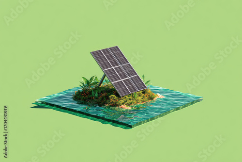 Solar panel green energy sustainable modern minimalist illustration island water nature eco friendly. sleek solar panel stands small lush island surrounded by water symbolizing clean energy