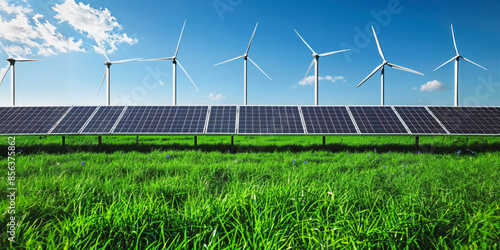Solar panels and wind turbines in a green field on a sunny day