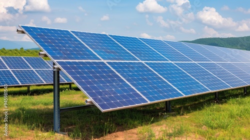 Solar panels in green field under blue sky
