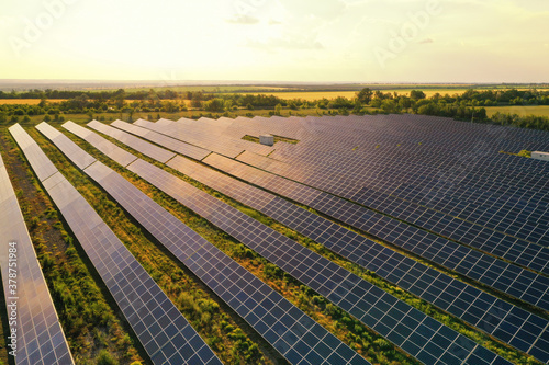 Solar panels installed outdoors, aerial view. Alternative energy source
