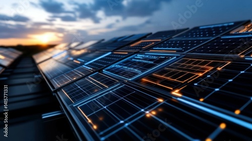 Solar panels with a tech interface overlay showing efficiency metrics.