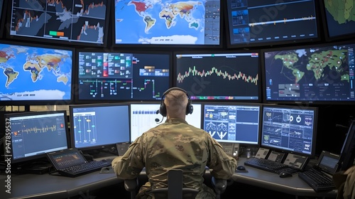 Soldier in Military Control Room with Headphones and Laptop, Military Control Room: Soldier Monitoring on Laptop, Soldier Using Laptop in High-Tech Military Control Room