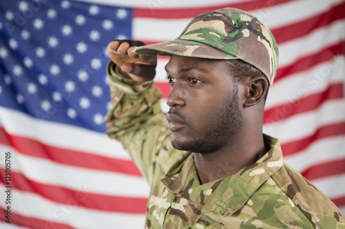 Soldier saluting against american flag