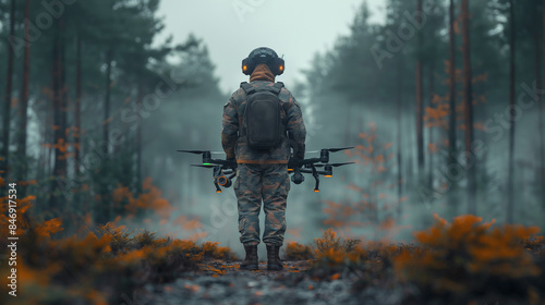 Soldier with drone in misty forest, merging military tech with nature for recon mission