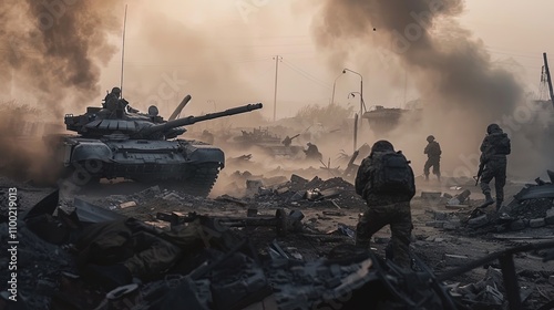 Soldiers advancing with tank in war-torn city under smoke-filled sky