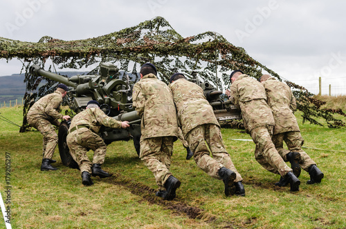Soldiers from the Royal Artillery Corp push a 105mm Light Gun into position underneath camouflage netting