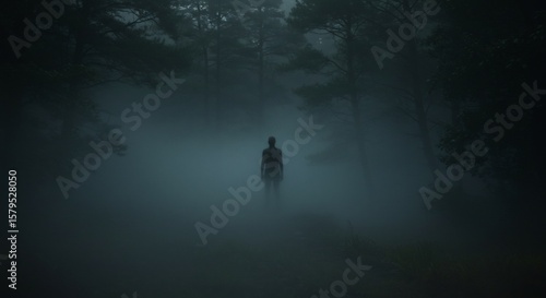 Solitary Figure in Eerie Forest Fog, Atmospheric and Mysterious Scene