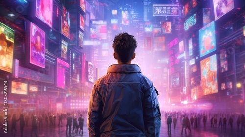 Solitary Figure in Sleek Urban Coat Silhouetted Against Neon-Drenched Cyberpunk Metropolis. Concept of Urban Isolation and Futuristic Anonymity.