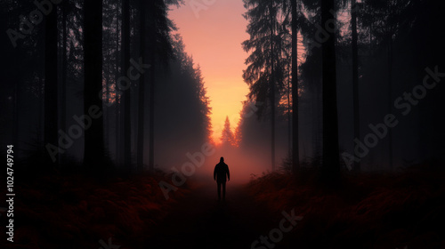 Solitary figure walking through a foggy forest at sunset during the twilight hours