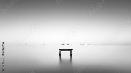 Solitary table in calm sea, misty morning; peaceful, contemplative mood; website background