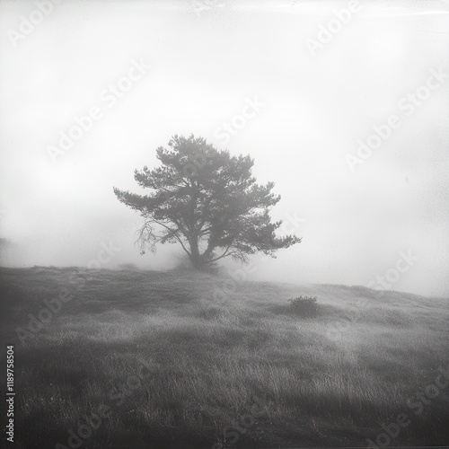 Solitary Tree in Foggy Field: A Black and White Landscape