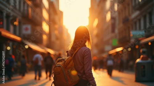 Solo Female Traveler Explores City at Golden Hour