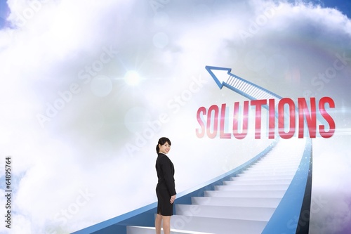 Solutions against red staircase arrow pointing up against sky