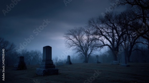 somber graveyard scene featuring weathered tombstones and barren trees casting long shadows under dim cloudy sky
