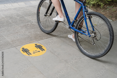 someone riding a bike next to a social distance sign drawn on the ground during covid pandemic