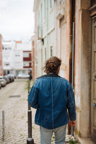 Someone wearing jacket wanders through historic cobbled streets