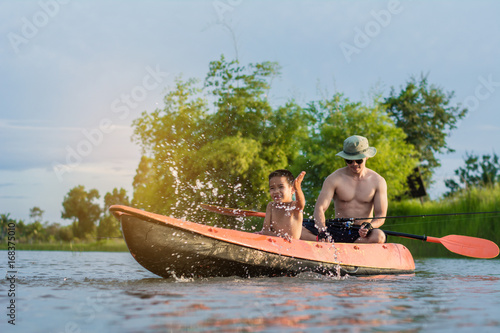 Son and father catch fish from a boat at sunset,a happy time for the holidays.