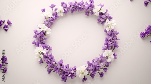 Sophisticated Circular Wreath of Purple and White Wildflowers on a Minimalist Background, Offering Ample Space for Custom Text for Invitations or Ads