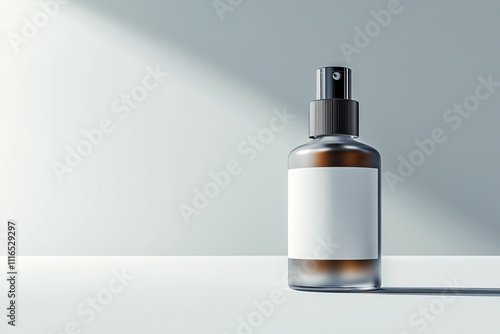 Sophisticated Spray Bottle Designs. A sleek glass spray bottle with a blank label sits on a minimalist surface, illuminated by soft light, creating a modern and elegant aesthetic.