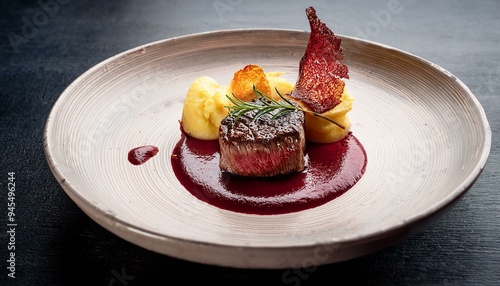 Sous-vide beef fillet with red wine foam and potato textures