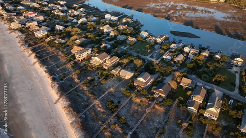 South Carolina coastline at Pawleys Island beach front homes, vacation beach rental property beside ocean with sandy shoreline at sunrise on beautiful morning by the sea