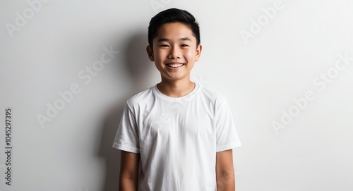 southeast asian teen boy white background wearing plain white tshirt smiling happy portrait