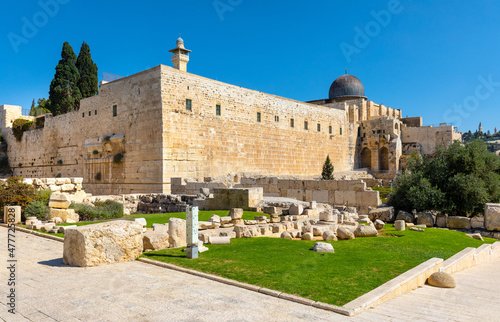 South-eastern corner of Temple Mount walls with Al-Aqsa Mosque and Davidson Center excavation archeological park in Jerusalem Old City in Israel
