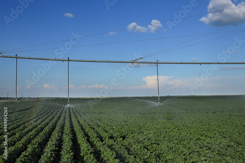 Soy bean field in spring with irrigation system for water supply, sprinklers sphashing water to plants
