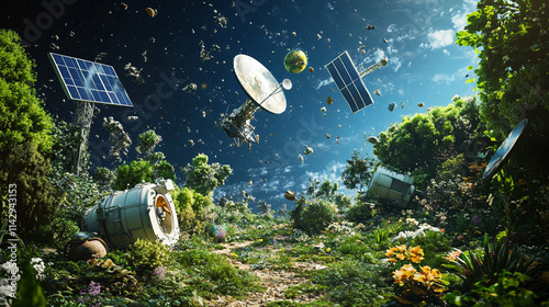 Space Debris in Lush Garden: Surreal 3D Rendering