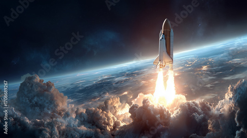 Space shuttle launches from Earth into the vastness of space, flames and clouds filling the scene with excitement and adventure Generative AI