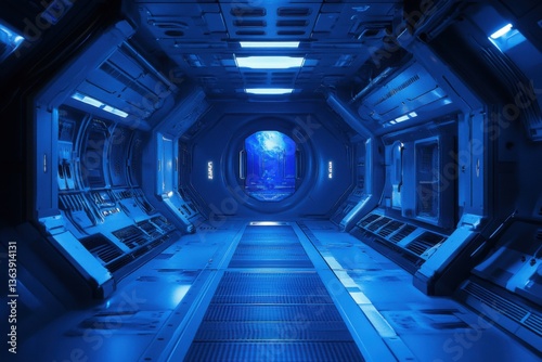Space station interior in sci-fi style with cool blue lighting and space for text on right