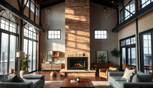 Spacious and Elegant Modern Living Room Design Featuring Cozy Fireplace and Abundant Natural Light